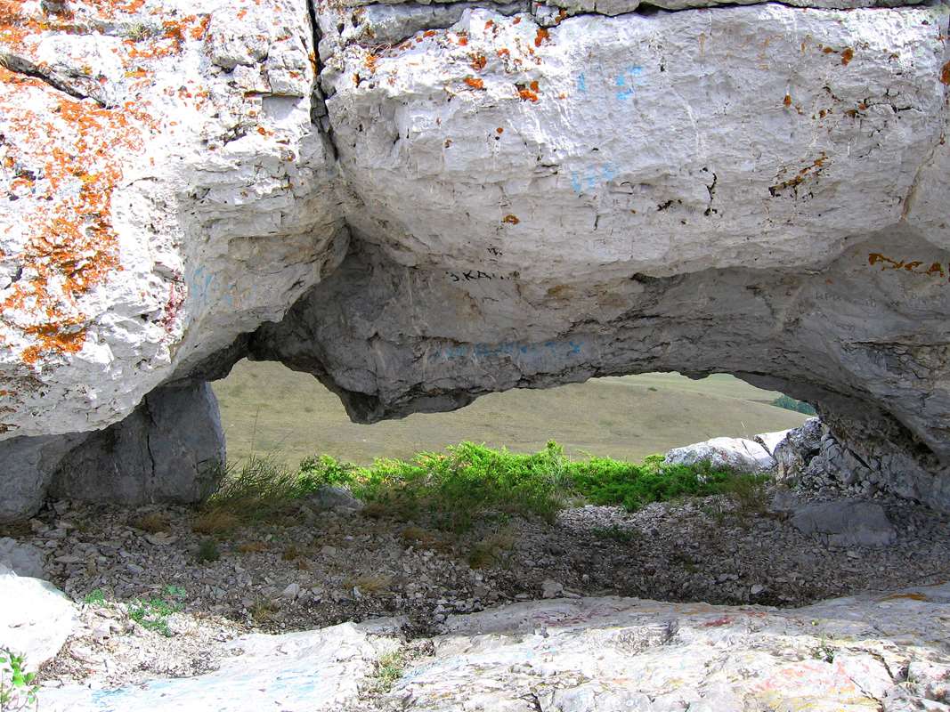 Медленно карабкаясь по склону, поросшему характерной для этих мест растительностью, мы ощутили невысокий «нрав» хребта – его максимальная отметка едва превышает 400 метров над уровнем моря. На вершине нас ждала живописная карстовая арка, словно окно в другой мир, где можно расположиться и окинуть взглядом окрестности Тишектау. Когда-то усергенские башкиры использовали её как наблюдательный пункт. А во времена гражданской войны здесь хозяйничали белые, преграждая путь красным. По рассказам местных, красные всё же отвоевали высоту и установили советскую власть.