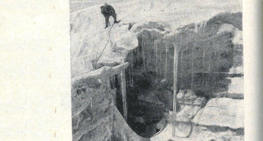 Ребята вбили ледорубы, туго натянули веревку. Ложусь на снег и по-пластунски осторожно ползу вперед. Зыбкий снежный панцирь подо мной готов в любую минуту сорваться вниз. То и депо под локтями проседает снег и я слышу, как в черной глубине ледовой трещины шуршат обвалившиеся куски. Выбрасываю вперед руку и загоняю лопаточку ледоруба в податливый наст. Не помогает: лопаточка лишь бороздит по снегу. Втыкаю в снег пальцы и осторожно подтягиваюсь. Наконец чувствую край трещины. Загоняю ледоруб до самой головки и начинаю медленно выползать. Попробовал упереться ногами, но в ту же секунду снежный мост тяжело осел и рухнул вниз. Как-то успеваю рывком податься вперед и с силой наваливаюсь на ледоруб.