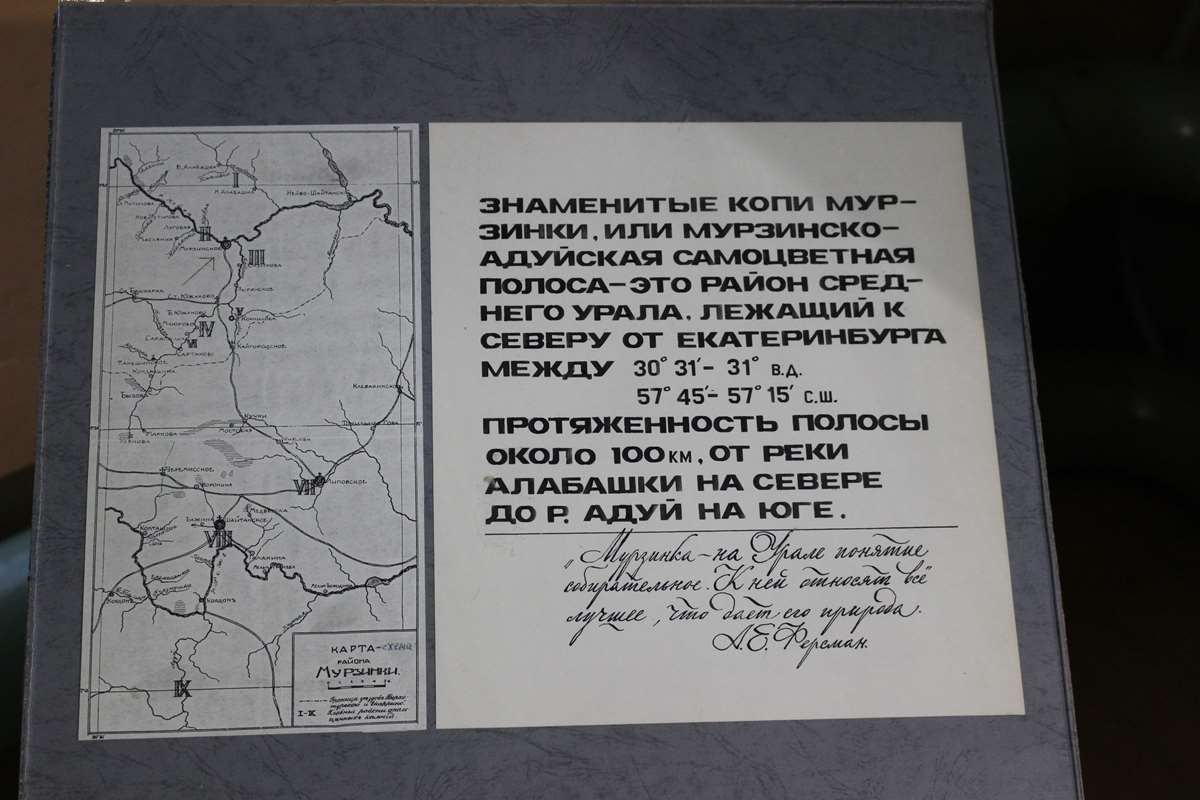 Это не совпадение и далеко не случайность. Вот что писал академик о Мурзинке в самом начале XX века: «Мурзинка не только гордость и ценность всех минералогических музеев мира, это начало русской минералогии, точного знания природных кристаллов».