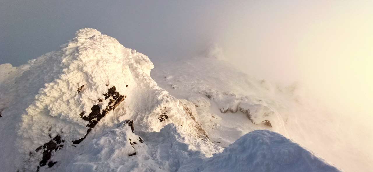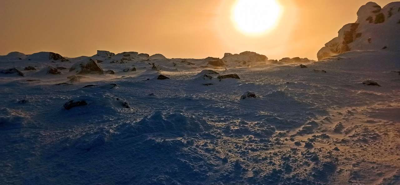 Не то, чтоб совсем видимость упала. Вполне пристойная осталась, метров сто. Но пространство сразу наполнилось шелестящей по щекам льдистой крошкой и нереальным жёлто-розовым всепроникающим светом заходящего солнца.