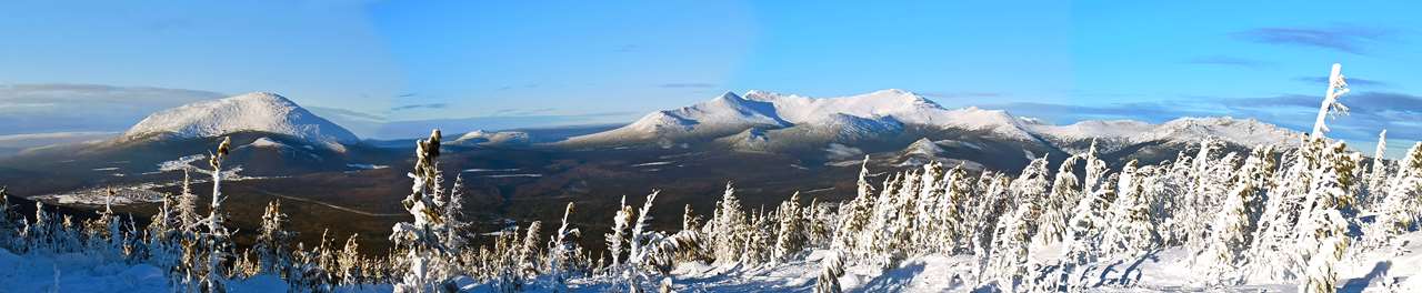 От «Звезды» открывается впечатляющий (даже для меня) вид на всю громадную подкову северной части массива. С запада на восток – это вершины Острая Косьва, Тылайский камень, Конжаковский камень (1569 метров, высшая точка Свердловской области; в нашем крае высшая – Тулымский камень, 1447 метров), Южный Иов, Серебрянский камень. Последний – невысокий, 1305 метров всего, зато самый красивый, весь в скалках и кулуарах. Далеко на западе отдельно торчит Косьвинский камень, куда с юга по тропе тоже непрерывно ходят туристы, как и на Серебрянский.