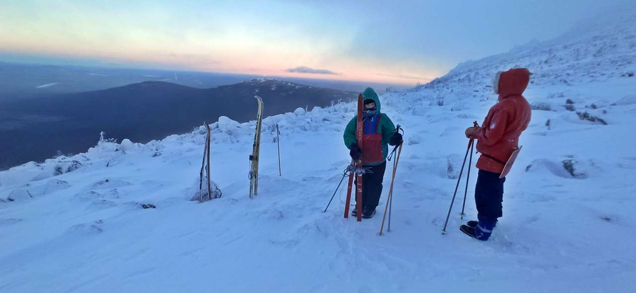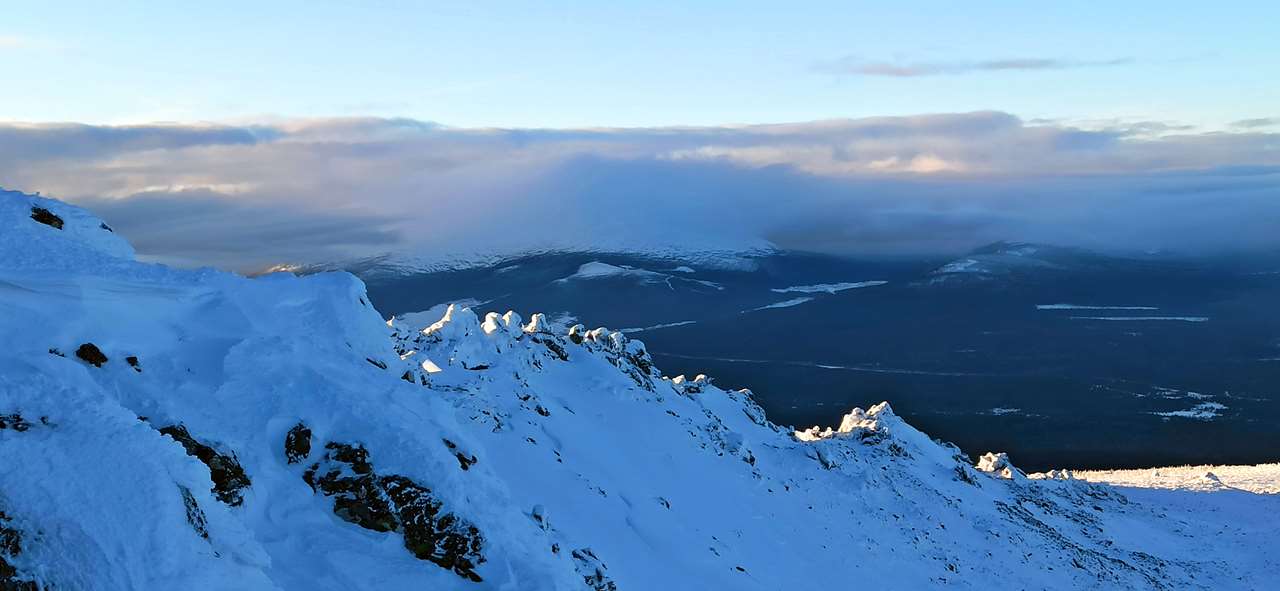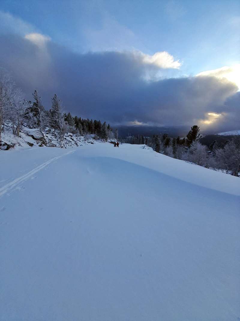 В общем, уходим отсюда. Шустро и быстро. К лыжам. На вершину поднялись? Поднялись. Всё, молодцы. Впереди-то вон ещё сколько…Сколько именно впереди, стало хорошо видно от лыж. Солнце почти село. Из туч мы довольно быстро выпрыгнули вниз, а они так и остались грызть вершину. Впереди у нас во-он тот длинный гребень, поросший лесом. Из него на фоне темнеющего неба торчит Васильевский, а Чёрную уже почти и не видно. Она же Чёрная, в смысле, покрытая лесом.