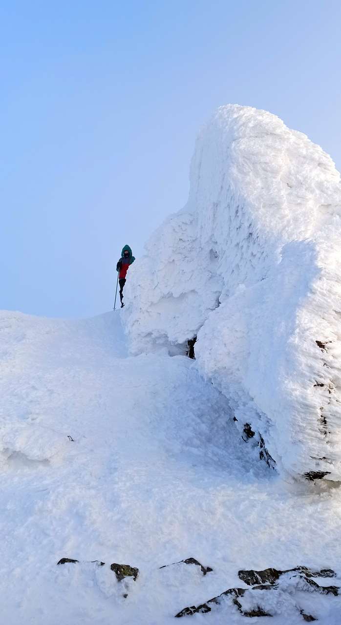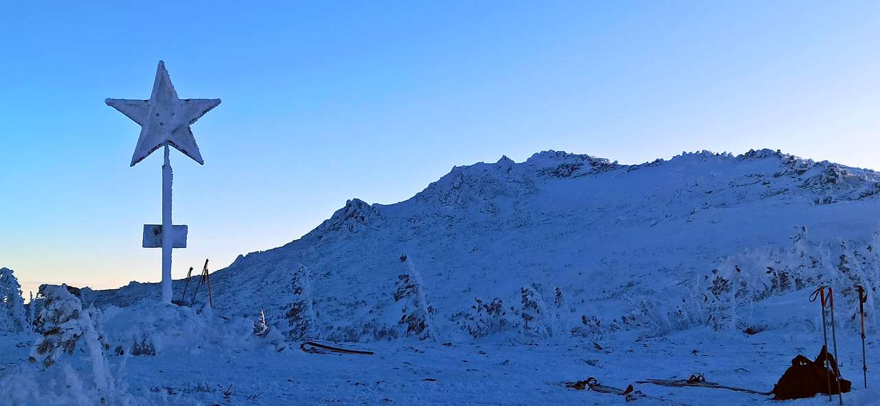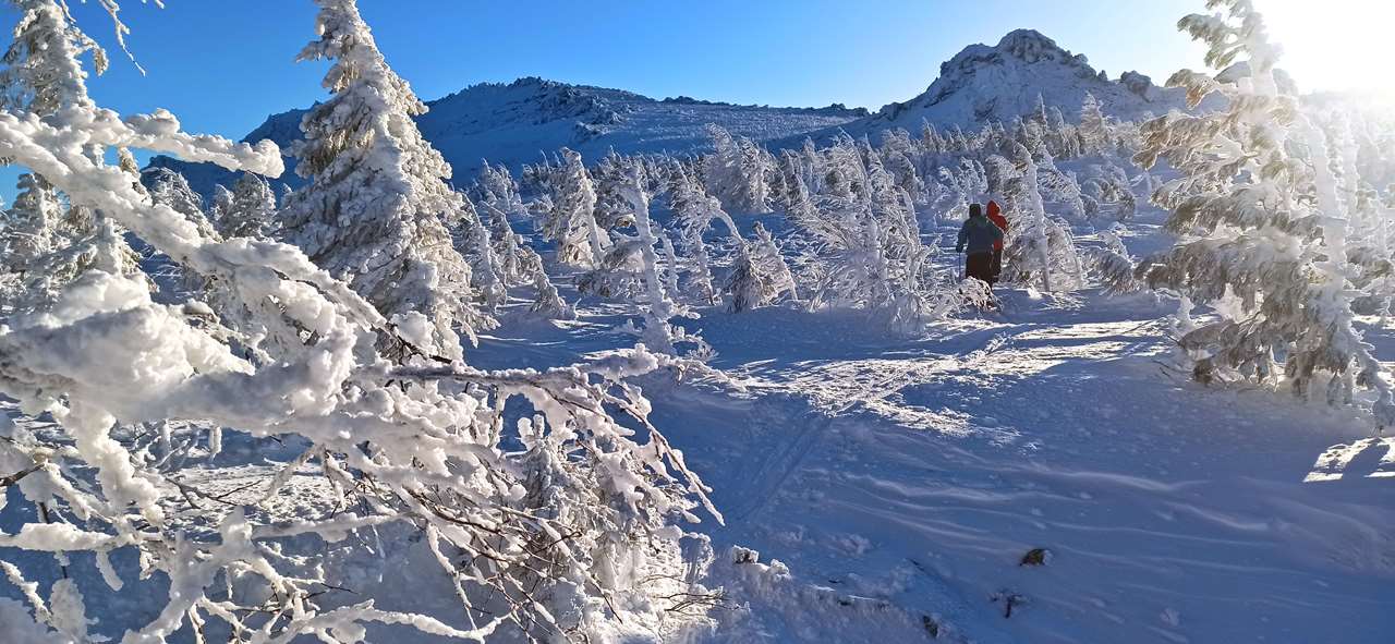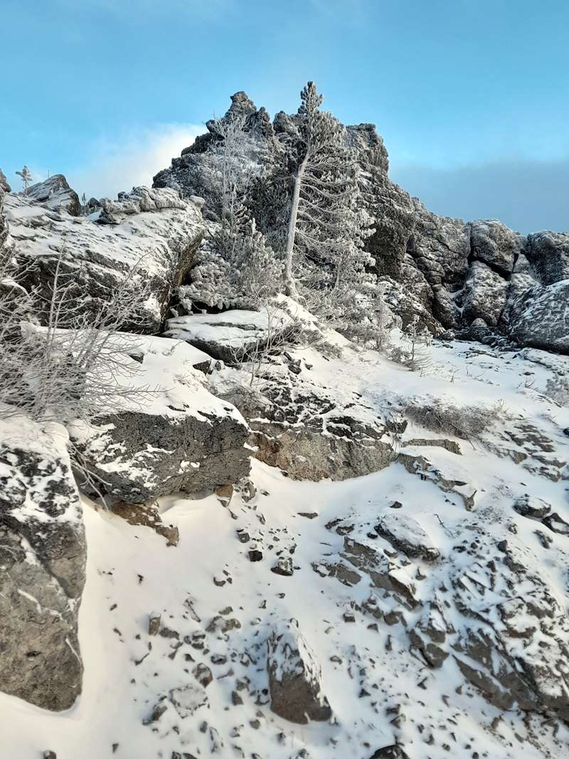 Утро, действительно, оказалось совсем не похожим на обычную уральскую новогоднюю муть. Видимость миллион на миллион, солнышко где-то «минус 15». Сущая Турция, курорт. Дорога до «Звезды» пробита снегоходами, в ростепели спрессовалась, теперь – как асфальт. Только искры из-под каблуков. Да, из-под каблуков, потому что лыжи на крутой части подъёма пришлось снять и волочить за собой. Отдача (проскальзывание назад) такая, что подниматься на них совершенно невозможно. Но лес-то уже совсем поредел, невысокие деревья плотно укутались в снеговые одёжки, значит, граница леса близко. Сухогорский с дороги прекрасно смотрится, такая фигуристая вершина на фоне белёсого неба… Да, что-то уже не голубого, а белёсого. Ну и что? Не беда…