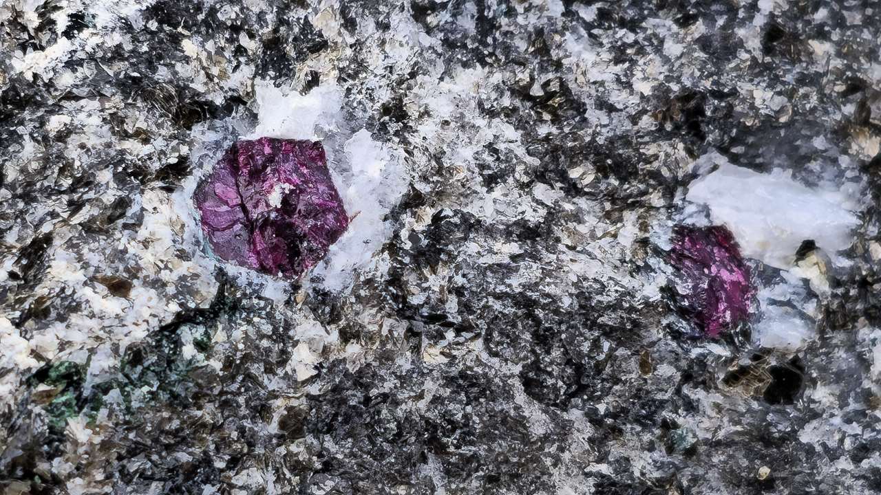 Данные каменные глыбы – это плагиоклазовые амфиболиты с кристаллами красного корунда. Отличительной особенностью вновь добытых пород от амфиболитов с «Рубинового лога» явилось развитие на контакте с дунитами и серпентинитами достаточно мощной зоны талькита, флогопита и крупных выделений хромистого паргасита (достаточно редкого минерала из группы амфиболов).