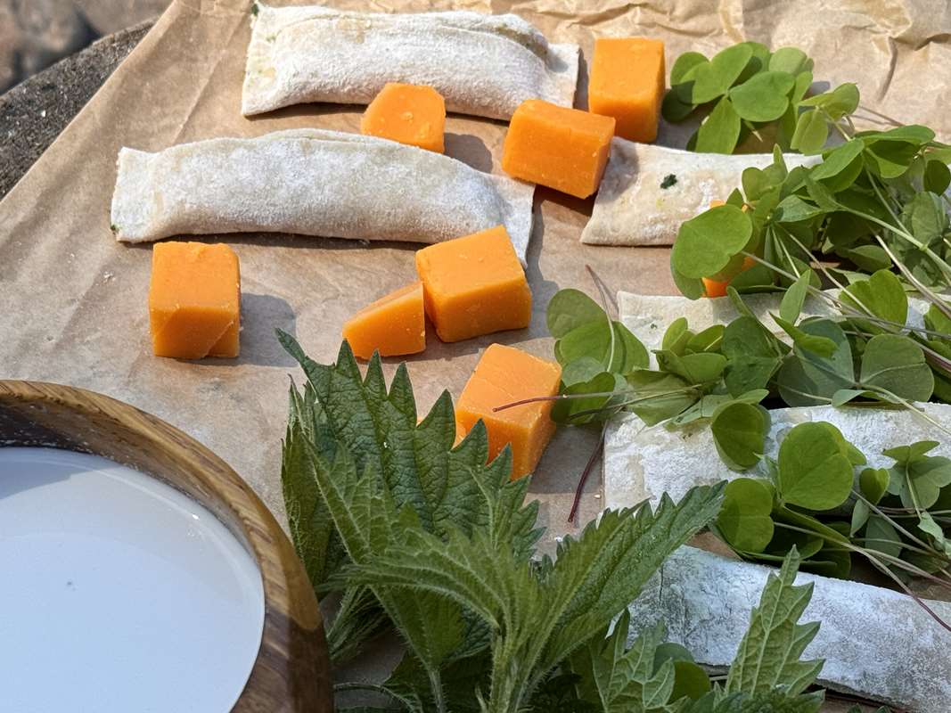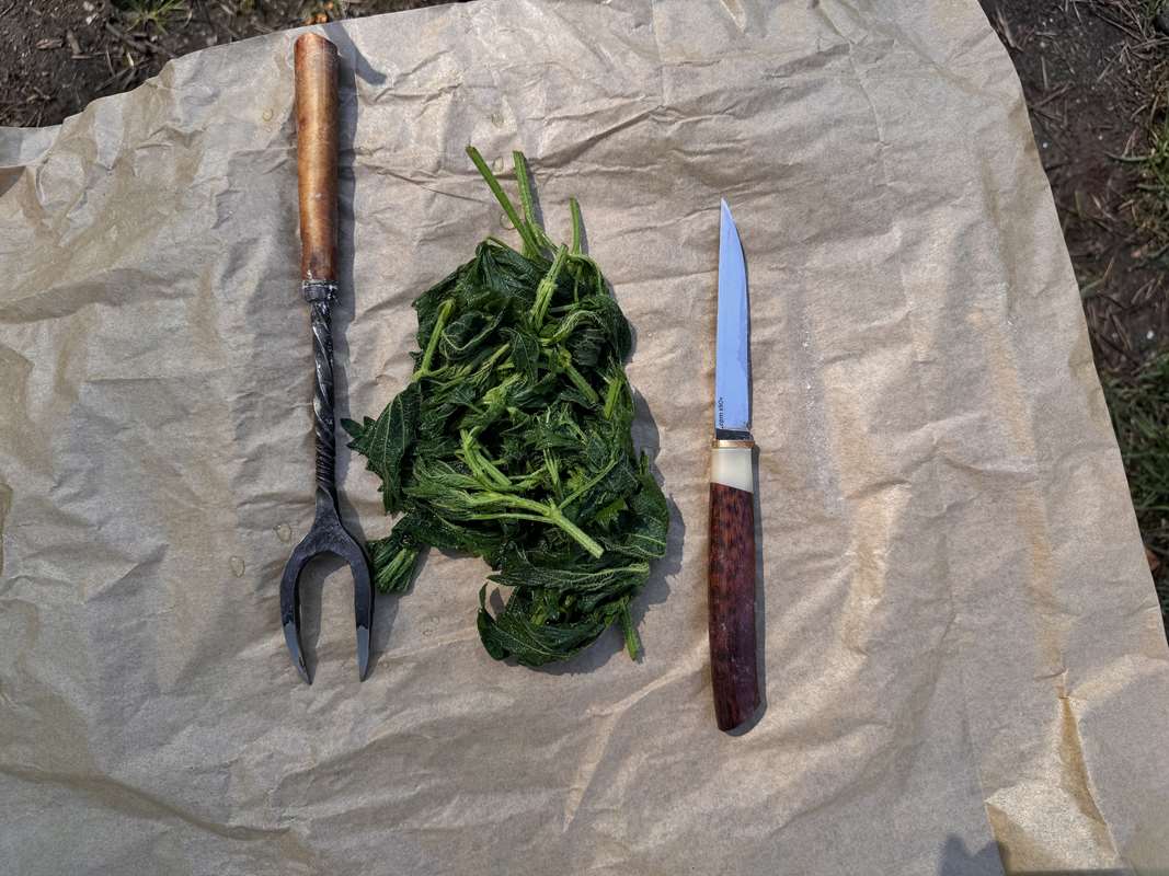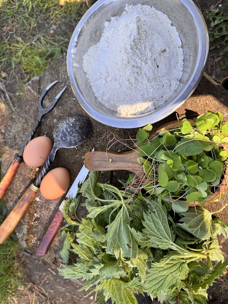 Ингредиенты для начинки: крапива (также подойдут такие дикоросы, как сныть, дикий щавель, дикий лук) – 400 грамм, куриное яйцо – 3 штуки, сливочное масло – 50–70 граммов, соль, перец – по вкусу. Для соуса: сливочное масло – 70–80 граммов, сливки (10%) – 400 миллилитров, твёрдый сыр – по вкусу (для загущения соуса)
