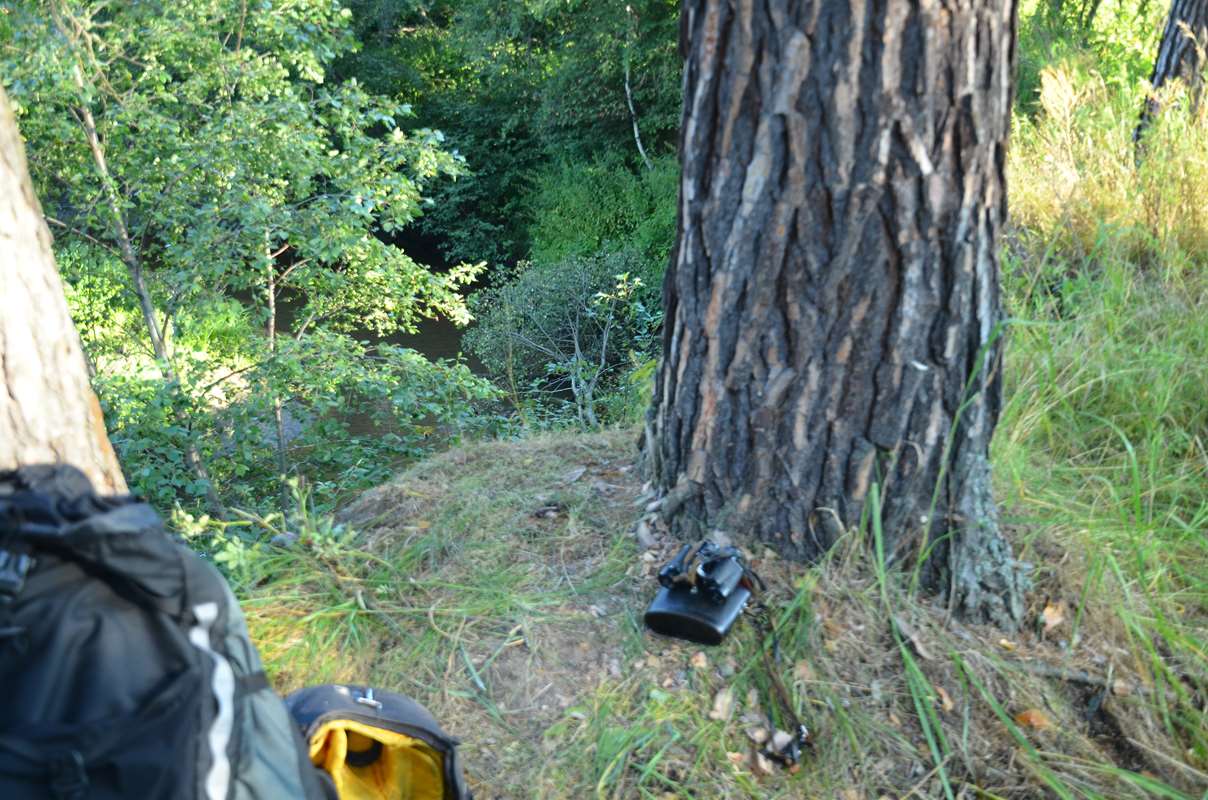 В одну из последующих ночей, зная про опасность быть «слегка примятым» копытами животных, на ночёвку я расположился на краю речного обрыва. Голова у меня со стороны леса была закрыта стволом огромной сосны метрового диаметра, а со стороны реки был отвесный обрыв примерно пять метров высотой. Получалось, что я обезопасил себя хотя бы наполовину. Звери могли подойти ко мне только со стороны зарослей, а со стороны обрыва это было исключено.