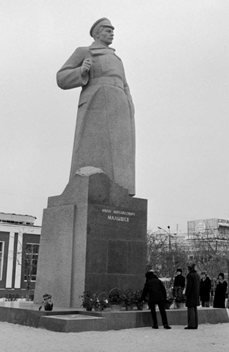 Работая в закрытом городе, первое время я частенько выбирался в «большой» Свердловск, заглядывал в «альма-матер» и в бывшее своё общежитие. В один из дней увидел на перекрёстке улиц Малышева и 8 Марта, прямо напротив 9-этажного здания популярного в то время центрального бытового комбината «Рубин», новый огромный монумент. Оказалось, это памятник уральскому большевику Ивану Михайловичу Малышеву (1889–1918) – уроженцу Верхотурья, первому председателю Екатеринбургского комитета РСДРП(б), участнику Гражданской войны и одному из первых комиссаров Красной Армии. Скульптурный образ показался мне знакомым. Лишь много позже, когда памятник Шиханову в Нижней Туре восстановили, я понял, что внешне он сильно напоминает скульптуру в Свердловске, где фигура Малышева тоже выполнена в полный рост, в застёгнутой шинели, в сапогах и фуражке. Разумеется, разница есть, но в глаза бросается как раз их похожесть. И, как выяснилось, автором обеих этих работ является свердловский скульптор В.Е. Егоров.