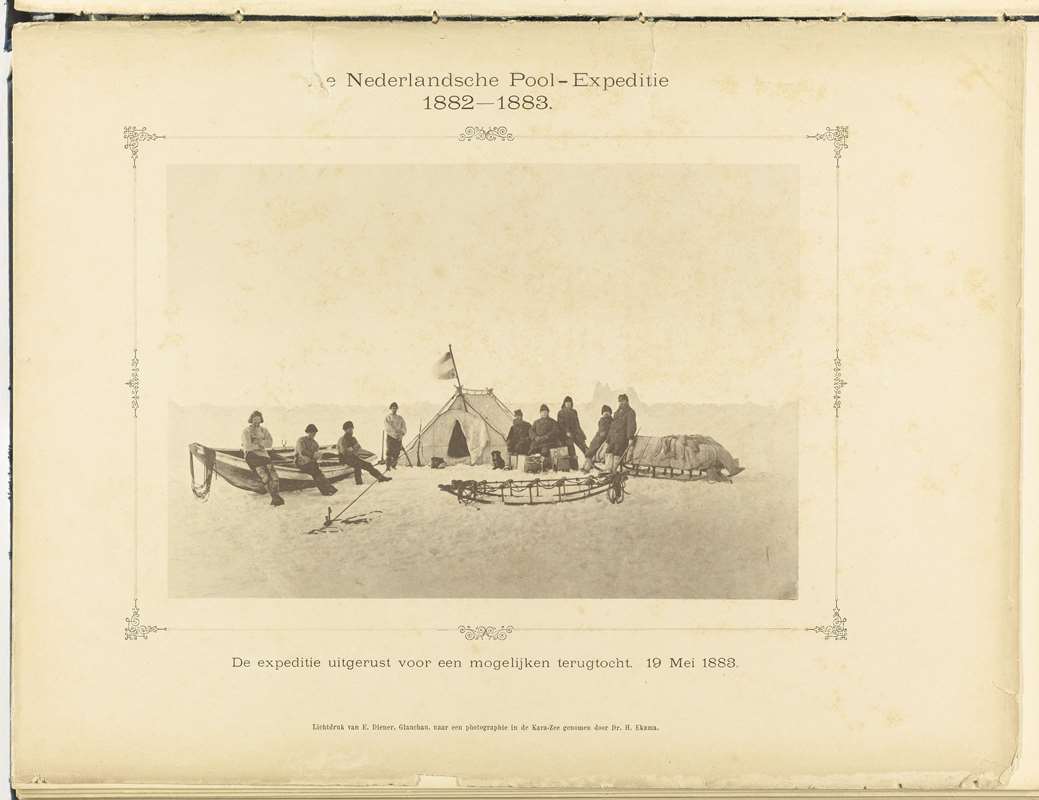 С нагруженными на четверо саней снаряжением в последних числах июля голландцы отправились в 140-километровый путь к Вайгачу. На случай преодоления полыней они взяли четыре лодки. ( с. 41. Голландцы и датчане с лодками и санями перед выходом в маршрут на сушу. 1 августа 1883 г.)