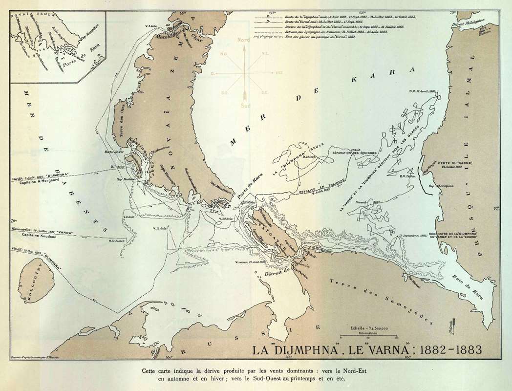 Скованные «ледяными клещами» суда дрейфовали вдоль западного берега Ямала примерно до 71о 30» с. ш. Это – самая северная точка дрейфа, находящаяся примерно в 250 км к северо-востоку от Вайгача. Тут «Димфна» и «Варна» оказались 13 марта 1883 года. Ветрами и течениями льды с зажатыми судами снова сносило к Вайгачу.