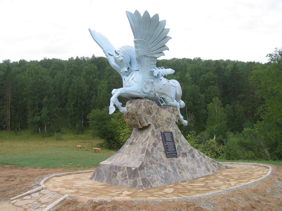 Нас встретила статуя Акбузата – мифического крылатого коня, воздвигнутая на берегу. Палатку разбили здесь же, у небольшой рощицы, примыкающей к водоёму. Окрестные земли овеяны преданиями.