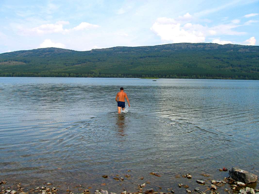 Первым делом мы искупались, ощутив приятную прохладу и прилив бодрости. Глубина озера достигает около двенадцати метров. После отдыха было решено прогуляться по намеченной тропе к вершине хребта Ирендык. Там, на открытом склоне, гранитные скалы образуют шикарные смотровые площадки с панорамными видами на всю округу.