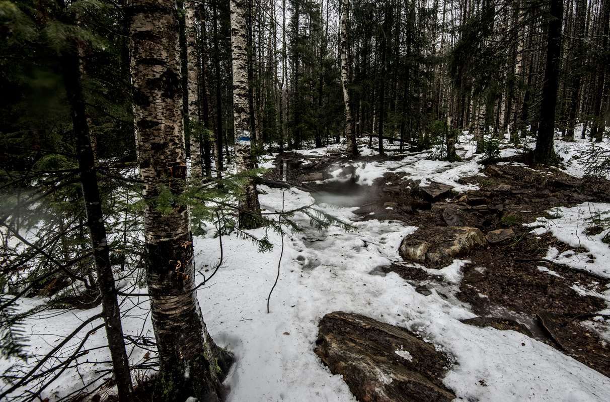 А дальше начался ад. Мне казалось, что шёл, на самом деле почти стоял на месте и шлифовал лёд, покрытый водой. Часто падал, тяжело поднимался, просто брёл вперёд в сплошном потоке воды на тропе, сворачивал на боковые дорожки, но они вели в огромные лужи. Что-то шумело в лесу, вспоминал стих про медведя, валежник и подснежник, светил вокруг фонариком и шёл дальше.