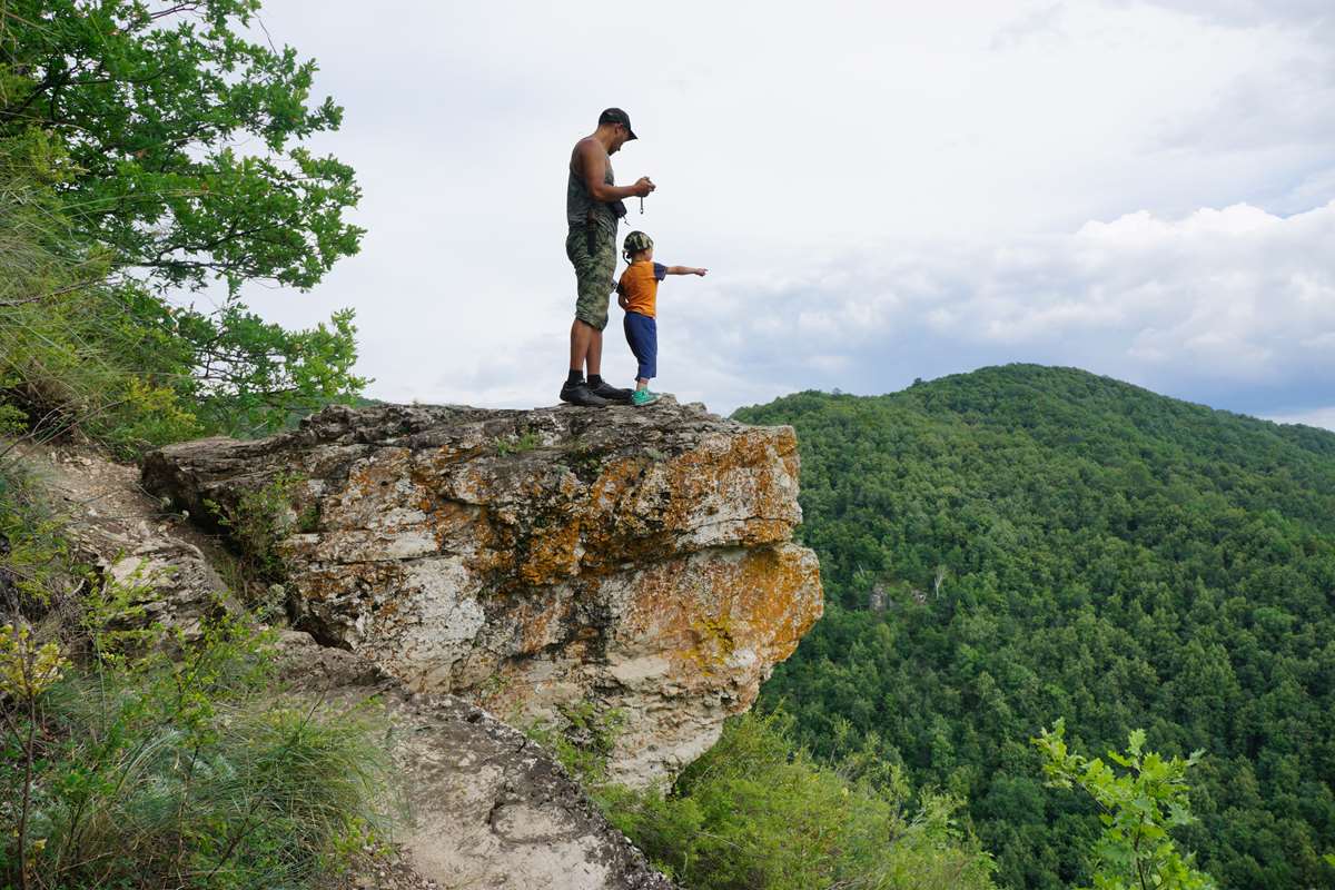 Первой на пути нам встретилась на склоне горы, куда пришлось карабкаться, сквозная карстовая арка под названием Уткас-Таш, что в переводе с башкирского означает «Сквозной камень». Посидели на её склонах и отправились дальше, в одно малоизвестное ущелье, где через пару километров нашему взору предстала пещера, вертикально уходящая вглубь. Это и был Бришский провал. Спускаться не стали, просто полюбовались сверху. Удивительно, как люди не могут найти это место?!