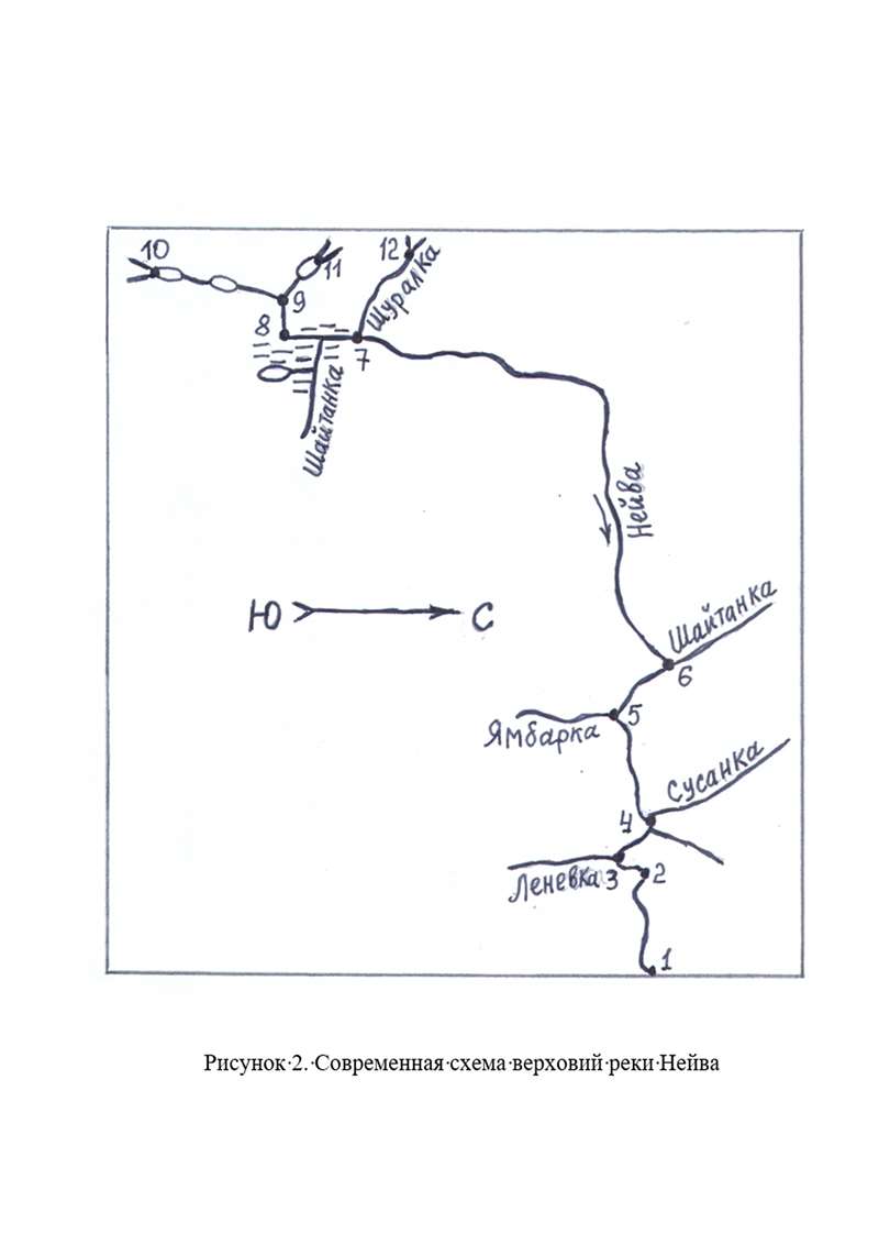 Древний уралец, скорее всего, отображал такие места реки на писаницах в виде одинарных или двойных зигзагов, по своей структурной логике отражающих именно разнонаправленное течение реки. Поэтому на схеме , опирающейся на современную географическую карту, прежде всего, отметим значительные и резкие изгибы реки. На рисунках 2 и 3 проставим номера точек в соответствующих местах. Точки 1 соответствуют месту нейвинских писаниц, расположенных компактно. Точка 2 располагается на значительной излучине, на которой отсутствуют притоки реки Нейвы в соответствии с рисунком писаницы. Точка 3 приходится на устье реки Большая Ленёвка. Точка 4 накладывается на большую излучину, в районе которой расположены устья рек Берёзовки и Сусанки (старинное название – Шайтанка). Точка 5 располагается в устье р. Ямбарки. Точка 6 соответствует крутой излучине, в районе которой расположено устье реки Шайтанки, идентифицированной с рекой, показанной в точке 6 на рисунке писаницы. Точка 7 находится в устье речки Шуралки, в верховьях которой расположена точка 12, соответствующая развилкам в верховьях этой речки. В районе точек 7 и 8 река Нейва протекает по заболоченной местности, обозначенной точками, нанесёнными в подпрямоугольном контуре на рисунке писаницы.