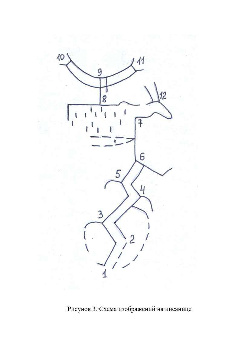 Практически все исследователи принимают этот контур за фигуру копытного животного. Я же полагаю, что он условно ограничивает район болот. «Брюхо» животного, о котором пишут некоторые авторы, скорее всего, соответствует знаку Шайтанского озера, которое через протоку и реку Шайтанку в этом месте соединяется с рекой Нейвой. Прямолинейный участок реки Нейвы между точками 8 и 9 соответствует линии, соединяющей прямоугольный контур с дугообразной двойной линией на рисунке писаницы. Точка 9 находится в устье реки, вытекающей из озера Чигирского (именно так оно обозначено на современной топографической карте). Одна ветвь дугообразной двойной линии на рисунке писаницы соответствует долине озера Чигирского (между точками 9 и 11), а другая её часть – истоковым верховьям реки Нейвы (между точками 9 и 11).